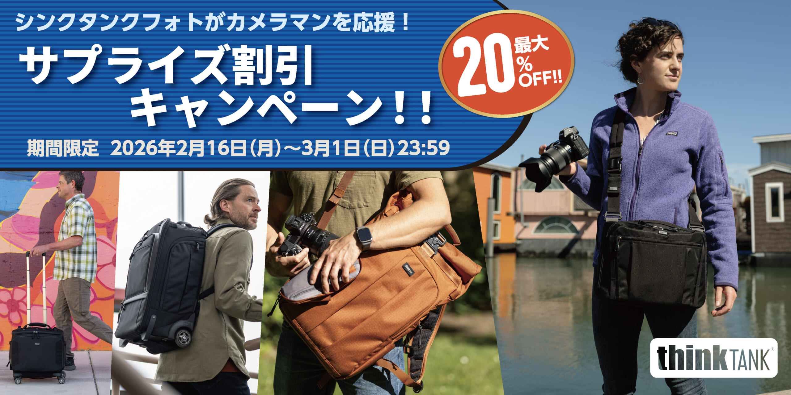 2026年2月16日(月)〜3月1日(日)に、同社の対象のカメラバッグが期間限定の特別価格で手に入る、「シンクタンクフォトがカメラマンを応援!サプライズ割引キャンペーン!!」 を実施します。